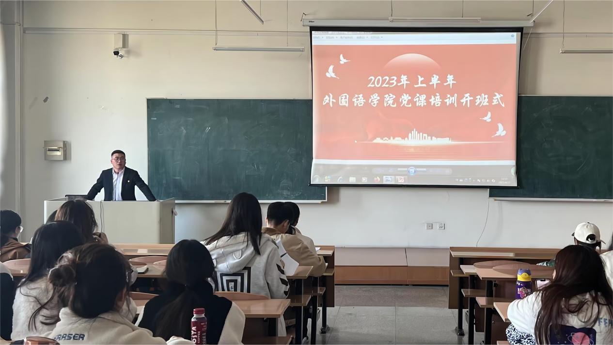 为深入学习贯彻习近平新时代中国特色社会主义思想,落实学校党委对主题教育的部署,深刻领悟“两个确立”的决定性意义,增强“四个意识”、坚定“四个自信”、做到“两个维护”,外国语学院党委扎实推动主题教育走深走实,组织部署分党校大力开展学习贯彻习近平新时代中国特色社会主义思想主题教育,并圆满完成2023年上半年外国语学院党校培训班工作。学院党委书记、党委副书记、党委组织员分别为培训班学员授课,并开展主题教育经典品读、主题研讨等交流分享活动。2023年4月23日中午于南区1号楼540教室举行2023年上半年学生入党积极分子、发展对象党课开班式。外国语学院党校主任丁鑫博担任主讲人。学院党委书记顾大兴为培训班学员作首场专题党课培训。