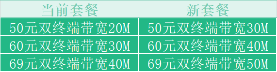 所有套餐的无线速率,均由12Mbps升级到提速后签约套餐的理论速率。即本学期开学时购买了20M校园宽带的同学,原本只享有12Mbps的无线上网速率和20Mbps的有线上网速率,而在本次提速后将享受到30Mbps的有线和无线速率。购买了40M校园宽带的同学,提速后相同文件下载时间从2小时19分缩短至32分钟。