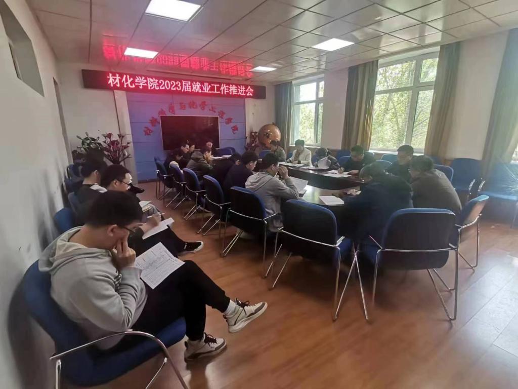 在深入开展学习贯彻习近平新时代中国特色社会主义思想主题教育之际,为贯彻落实学校关于促就业攻坚行动的工作部署,进一步提高材化学院2023届毕业生就业工作质量水平,材化学院于5月6日14:00在学院427会议室召开2023届毕业生春季就业工作推进会,院长董丽敏主持会议,院领导班子、各系主任、支部书记、毕业班辅导员参与会议。