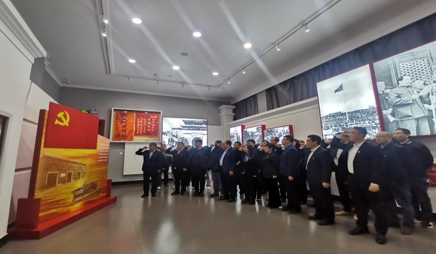 在党旗的见证下,在革命先辈的铁骨铮铮中,材化学院党委成员带领教师党员重温入党誓词。