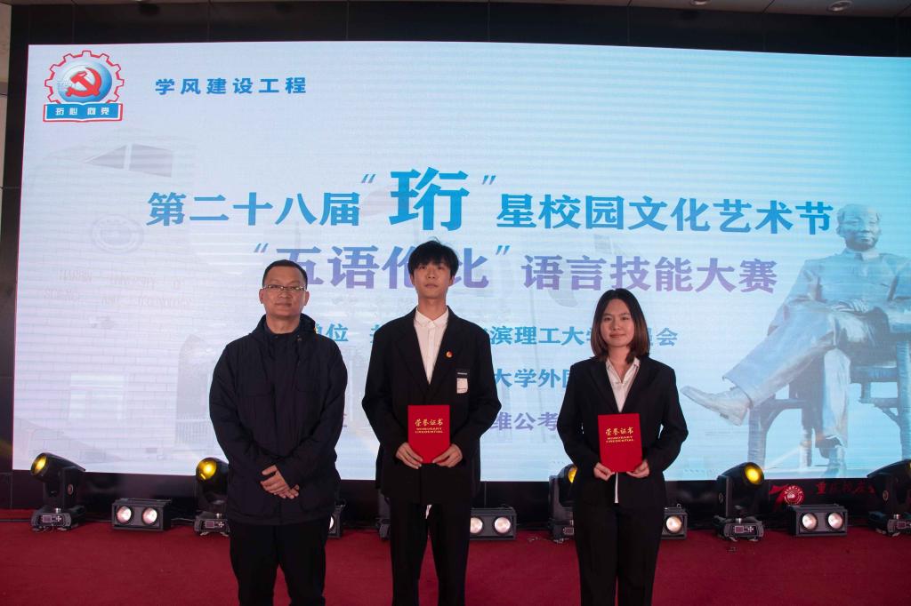 为学习弘扬党的二十大精神,扎实推进习近平新时代中国特色社会主义思想主题教育,贯彻落实学校“珩心向党”党建品牌建设工作,进一步增强青年学生的思想和价值引领、拓宽学生国际视野、提升学生的语言应用能力和国际传播能力,5月12日18时,外国语学院团委、学生会在哈理工西区1号楼0220报告厅成功举办了第28届大学生文化艺术节暨“五语伦比”语言技能大赛。外国语学院党委书记顾大兴、党委副书记蔡野出席本次大赛;外国语学院团委书记马宁老师、英语系徐丹老师、日语系周广老师、俄语系徐玉伟老师、哈尔滨哈普电器技术有限责任公司外贸销售经理张皓维担任本次大赛的评委;外国语学院辅导员贾昊鹏老师为本次大赛组织指导教师。