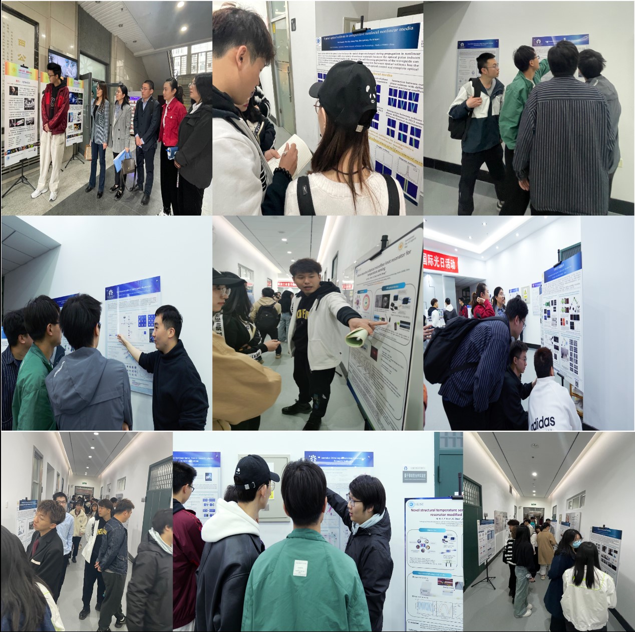 5月16日9点在新主楼B区大珩中心举办科研成果交流和科普宣传活动,本次活动由中国光学学会哈理工学生分会负责人带领会员同学们在老师指导下完成。参加活动的有光学工程、仪器科学与技术学科的硕士和博士研究生、光电信息科学与工程专业的本科生以及其他学院对光学感兴趣的师生等。光学学会的会员与来自各专业的研究生和本科生们在大珩中心进行了热烈的学术交流,海报前的学生们热烈探讨着相关领域的优秀成果。研究生之间的融洽交流体现了同学们浓厚的科研兴趣,对光学感兴趣的本科生也积极加入并认真学习,对感兴趣的科研成果进行记录并表示后续会进一步交流,这正体现了本次交流会的意义。同时在大珩中心门口循环播放光学科普知识的宣传视频,并制作了科普宣传海报,为我校师生和工作人员宣传光在科学、文化、艺术和教育以及医药、通信、能源等多个领域中的重要作用。
