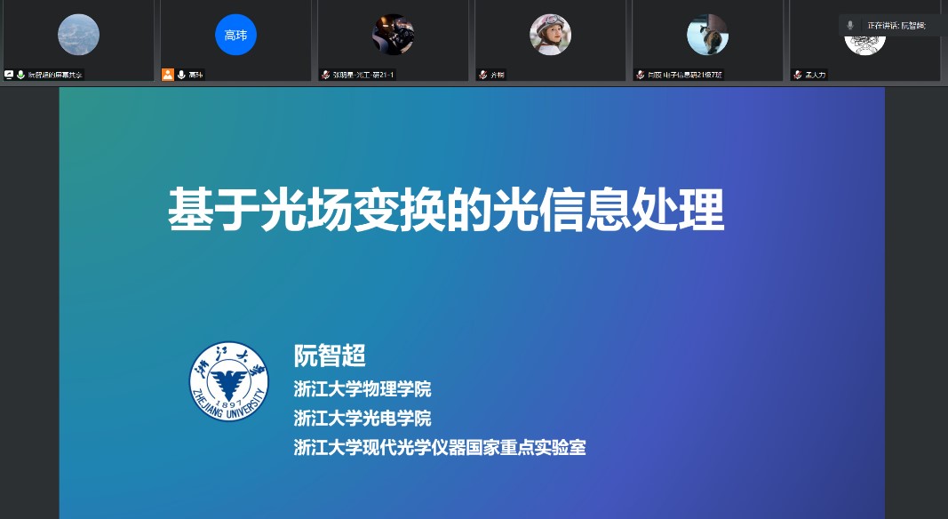 阮智超教授以题为“基于光场变换的光信息处理”为我校师生进行了线上学术报告。报告主要介绍了基于空间光场变换的光学模拟计算、基于时空涡旋的微分器和空间光学Ising机,报告内容展示了光场变换的光信息处理前沿研究以及阮教授团队的最新优秀成果。阮教授的精彩报告对我校相关科研方向的师生具有重要启发意义,会后师生也进行了热烈讨论,进一步开拓了视野,拓展了科研思路。