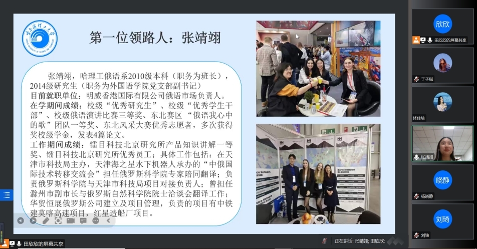 张靖翊,哈理工俄语系2010级本科(职务为班长),2014级研究生(职务为外国语学院党支部副书记)。目前就职单位:明威香港国际有限公司俄语市场负责人。