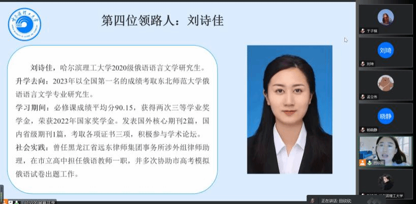 刘诗佳主要从研究生所修课程、全国俄语专业博士点及个人备考经验展开分享。刘诗佳讲到:我们要尽早明确自己的属性,尽早做出职业规划。读博是一条艰辛的旅途,在读博的过程中,我们时常会在迷茫中渡过,但只要我们坚定心底的目标,就会找到自己的方向。”