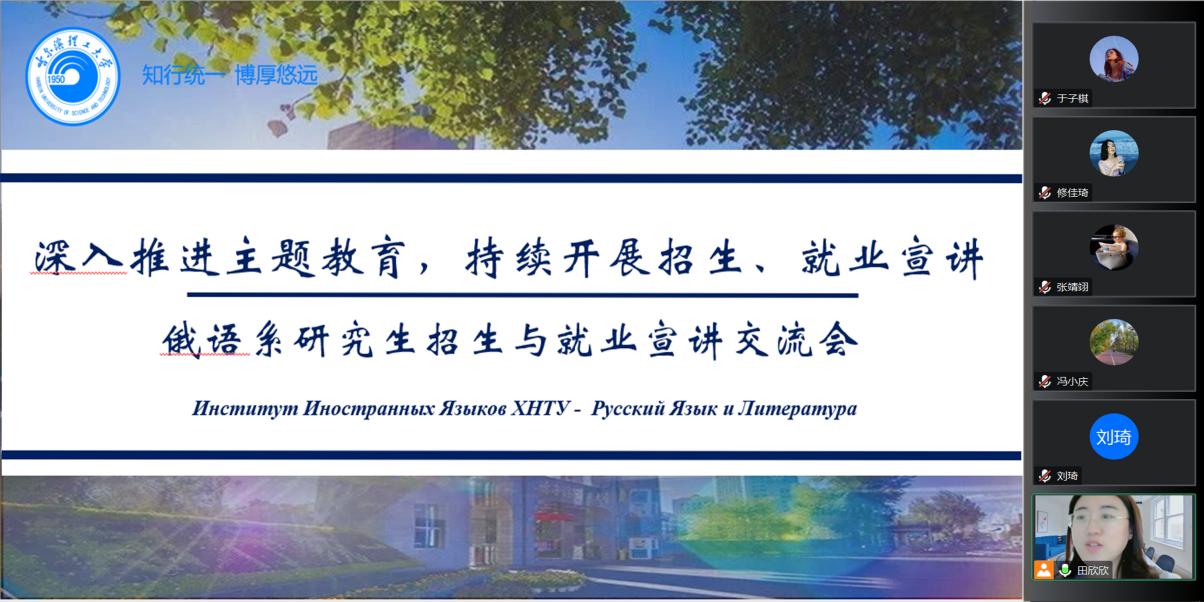 为深入贯彻学习党的二十大精神,深入贯彻习总书记关于就业工作的重要指示精神,在外国语学院党委的带领下,俄语系始终立足学生专业发展,重视学生全面发展。为切实做好研究生招生与就业工作,让学生进一步明确学习目标,做好职业生涯规划,俄语系于5月17日18:30举办“深入推进主题教育,持续开展招生、就业宣讲”俄语系研究生招生与就业宣讲交流会。俄语系党支部书记田欣欣主持本次宣讲交流会,俄语系全体教师、本科生及研究生于线上参会。此外,本次宣讲会邀请4位俄语系优秀毕业生分享学习经验及就业心得。