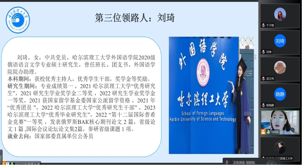 刘琦,女,中共党员,哈尔滨理工大学外国语学院2020级俄语语言文学专业硕士研究生,曾任班长、团支书、外国语学院院办助理。就业去向:国家部委直属单位公务员