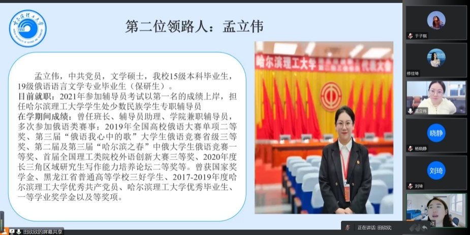 孟立伟,中共党员,文学硕士,我校15级本科毕业生,19级俄语语言文学专业毕业生(保研生)。目前就职:2021年参加辅导员考试,以第一名的成绩上岸,就职于哈尔滨理工大学学生处少数民族学生专职辅导员。