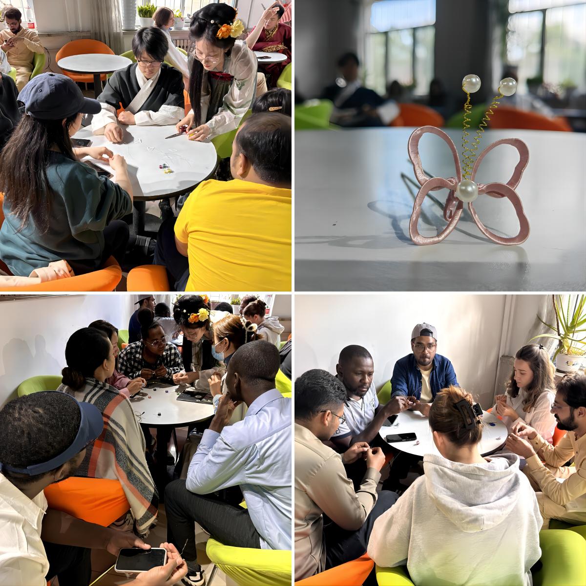 华夏有衣,其名汉服。留学生们在汉服社同学的引领下,穿越千载岁月,了解中国不同朝代、不同形制的汉服以及基本的汉服礼仪知识,领略汉服所代表的中国优秀传统文化底蕴。留学生们还试穿了汉服社精心准备的各式服饰,亲身体验了褒衣博带、华美飘逸的汉服之美,举手投足之间亦能显露独特的汉家风仪。在随后的击鼓传花和制作缠花环节,大家踊跃参与,体验中国非物质文化遗产的魅力及传承创新,感受到华夏民族礼仪之邦的风采。