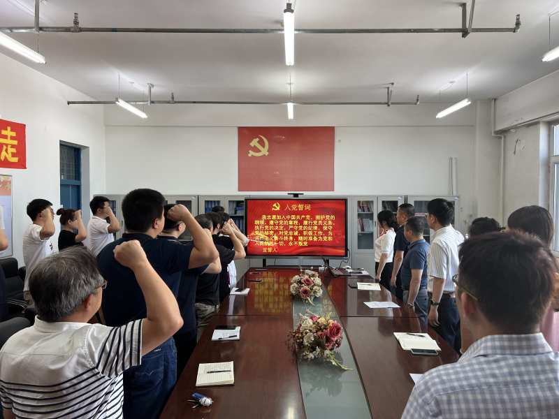 随后,全体党员佩戴党徽、整齐列队、面向党旗肃立。胸前的党徽与面前的党旗交相辉映,熠熠生辉。在2021-2023年度校优秀共产党员段云菲同志的带领下,全体人员举起右手,神情庄严坚定,热情庄重地宣誓入党誓词:“我志愿加入中国共产党,拥护党的纲领,遵守党的章程……随时准备为党和人民牺牲一切,永不叛党。”誓词掷地有声,铿锵有力!让全体党员的心灵接受了深刻地洗礼。铮铮誓词也让每一位党员心潮澎湃,精神振奋。