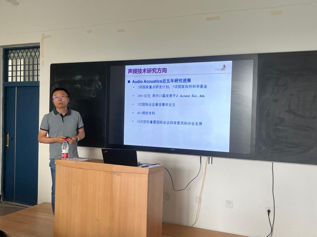 首先,卢晶教授作了题为《声频技术无处不在的应用》的学术报告,报告首先介绍声频技术(Audio technology)在研究可听声频段声音的物理与感知机理,探索其应用,内容涵盖现代声频技术与通信、互联网、多媒体、人工智能以及虚拟现实技术的紧密结合等。之后,卢晶教授详细介绍声频技术的应用场景和关键技术点,并介绍南京大学声学学科近期在该领域的研究和应用进展。在报告中,卢晶教授通过通俗易懂的语言对研究成果进行了讲解,展示声学发展历史对人类进步的贡献,定向声频技术在汽车、公共场所的应用,可有效的降低噪声影响,提高人民生活质量。