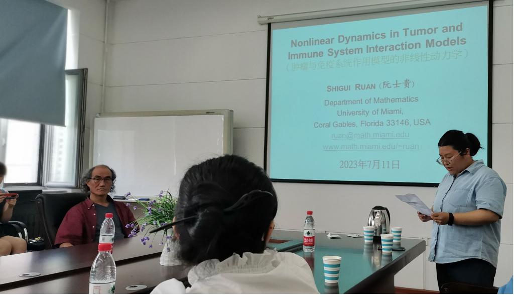 阮士贵教授作了题为“Nonlinear Dynamics in Tumor and Immune System Interaction Models” 的学术报告,详细介绍了免疫系统与肿瘤的相互作用,肿瘤免疫数学建模的思想方法,免疫系统的工作原理,癌细胞的特征,免疫系统与癌细胞相互作用的动态过程,肿瘤免疫逃逸机理,现阶段肿瘤免疫治疗的方法和药物以及肿瘤免疫数学模型研究的发展历程及最新研究成果。阮教授指出“数学建模可以在实际研究中扮演非常重要甚至是不可或缺的角色,起到实验学科不能发挥的作用:可以更好地理解免疫系统与肿瘤的相互作用,可以帮助开发新的治疗药物,可以帮助设计最优治疗方案等。”阮教授进一步分享了他们团队应用微分方程研究肿瘤免疫相互作用的最新研究成果。