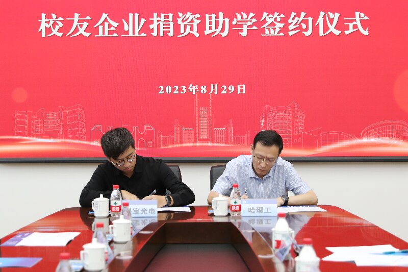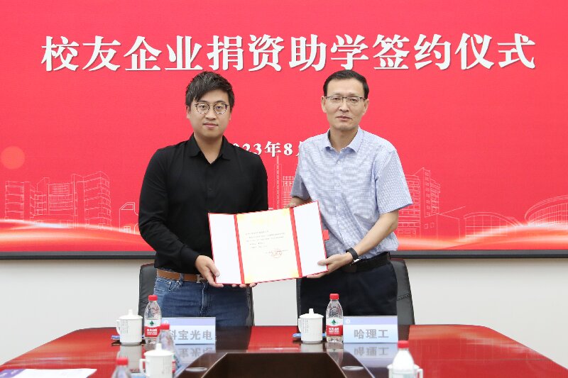 郭加利与苏州科宝光电科技有限公司董事林华殷签订捐赠协议,科宝光电向哈尔滨理工大学捐赠人民币50万元,设立学生奖学金项目。郭加利代表学校对科宝光电的捐资助学行为表示诚挚的感谢,向捐赠企业颁发捐赠证书。