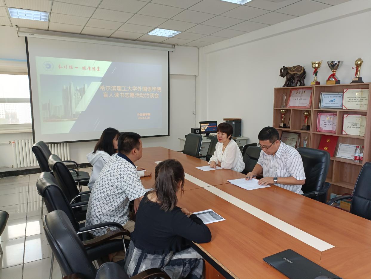 8月30日13时,哈尔滨理工大学外国语学院在南区一号楼701举行“点燃希望之火,感受最美书声”盲人读书志愿活动启动仪式。本次启动仪式采取线上+线下相结合的形式,中国盲文图书馆志愿服务项目部胡梅主任通过线上参加此次活动;院长马艳辉、党委副书记蔡野、研究生辅导员马宁以及院研究生会学生干部孙添艺、陈渤阳线下参与此次活动。