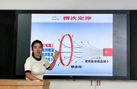徐帆老师讲授的是电磁感应定律,从现实出发,引入理论结合实例,可以把这些基本概念和定理生动的讲解,使学生掌握电和磁的关系。通过物理知识的学习与思维的训练,培养学生的分析问题和解决问题能力,培养学生探索精神和创新意识,努力培养学生独立学习的能力,同时,使学生能够掌握利用物理知识解决技术问题的能力,培养学生通过建立物理模型解决具体问题的能力。