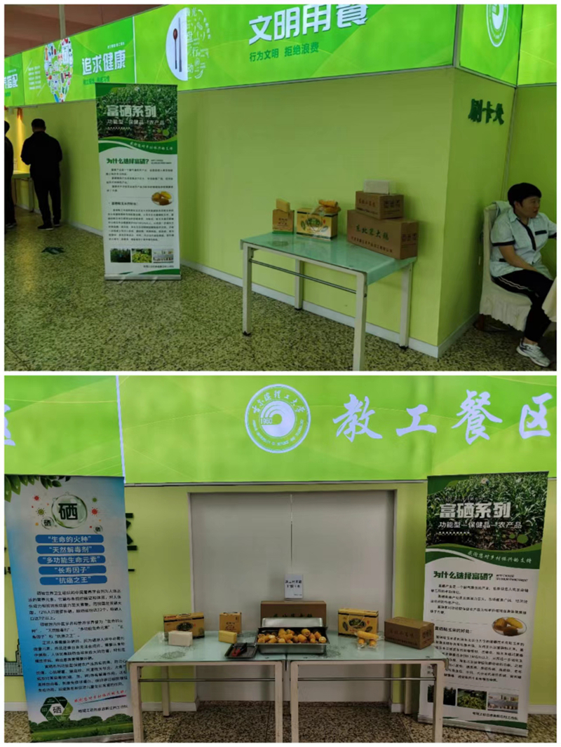 此次活动分别在西区、南区食堂举行,新立村的富硒粘玉米、富硒小米、富硒大米、富硒粘玉米大碴子、土鸡蛋、笨小鸡、笨大鹅等多种特色农副产品走上展台,为老师们提供绿色健康的美食。我校驻村工作队从农产品选种、播种、富硒、收割和成熟后的色泽等多方面向老师们进行介绍,并邀请老师们品尝特色农产品富硒粘玉米。老师们品尝后都称赞富硒粘玉米甘糯可口、味道香甜,还有部分老师现场购买农产品。