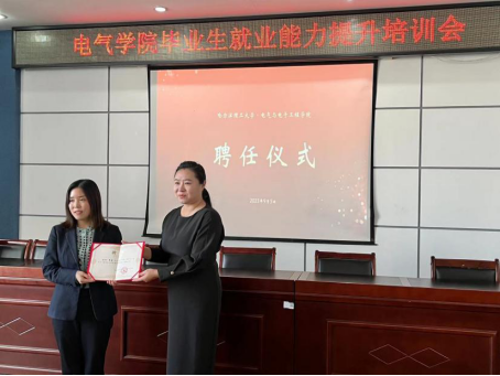 就业是最大的民生工程、民心工程、根基工程,是事关广大学生切实利益的大事,为贯彻落实习近平总书记重要指示精神和黑龙江省就业工作要求,进一步强化毕业生就业服务,推动毕业生高质量充分就业,学院结合自身实际情况开展“2024届毕业生就业能力提升培训”系列活动,院党委副书记兼副院长张颖为亨通光纤制造研发中心宋君总经理颁发聘书,聘请宋君总经理为电气与电子工程学院“大学生成长规划导师”。