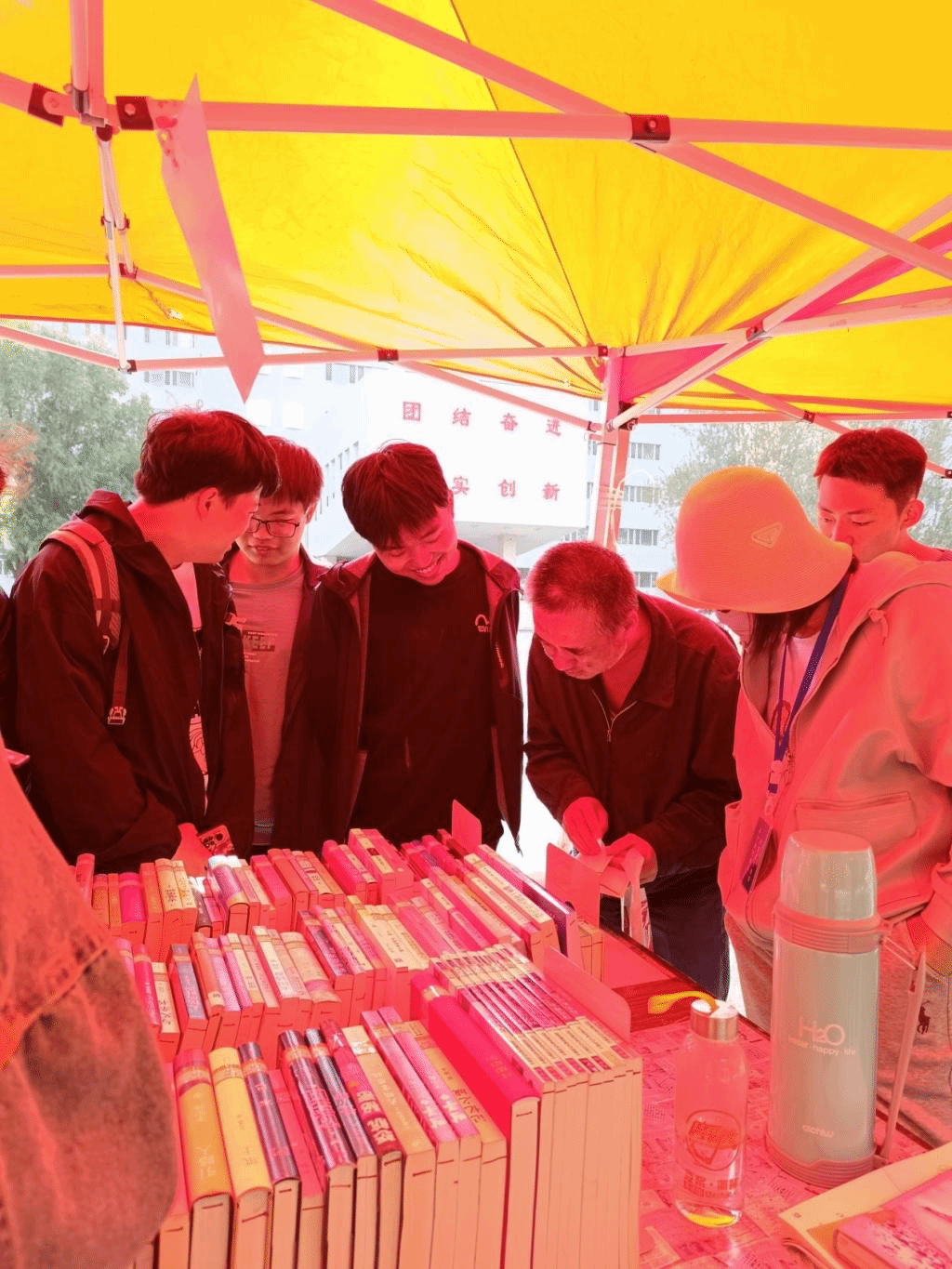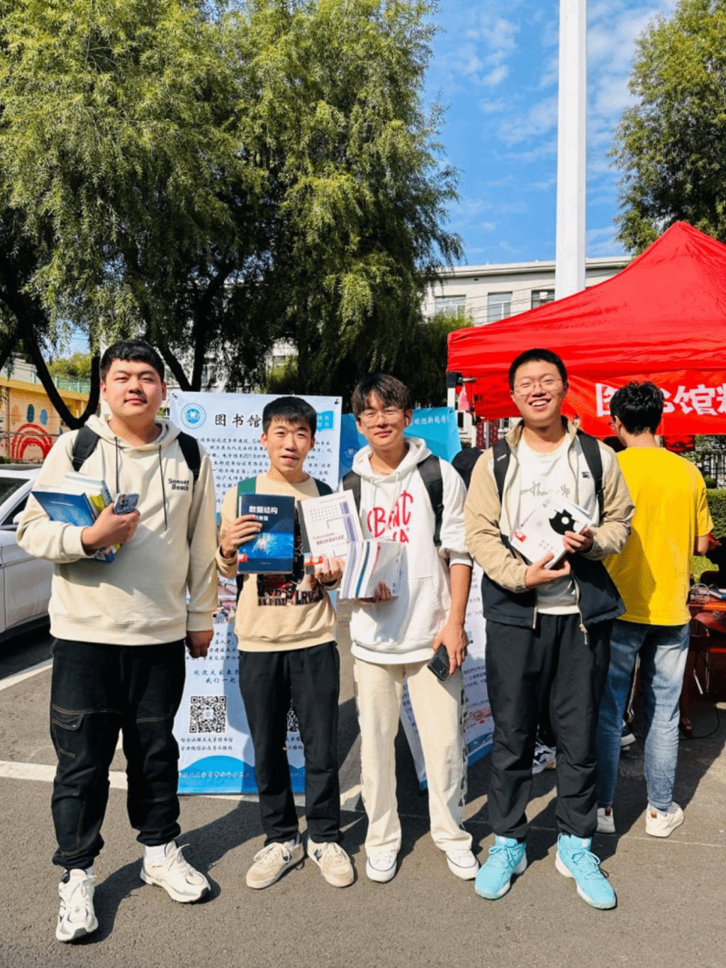 在书展上借到心仪图书的同学们一起合影留念