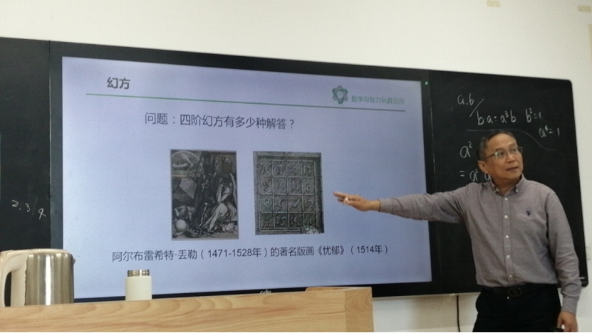 报告中,林亚南教授利用生活中的益智游戏,从七巧板、幻方、多边形密铺以及名画蒙娜丽莎的微笑-摄影棚中照片变化的奥妙等游戏出发,分析了益智玩具的类型及不同玩法,巧妙的讲解了置换的定义,以及置换群、加群的阶的概念,并就此证明了加倍置换的定理,揭示了益智玩具玩法中蕴含的数学思想、方法及原理,引导如何从益智玩具的玩法中凝练出数学问题,如何将数学知识玩具化,展现了从现实问题到数学建模,利用数学知识解决问题的过程,引导如何用数学思维观察现实世界,学会用数学语言表达现实世界。