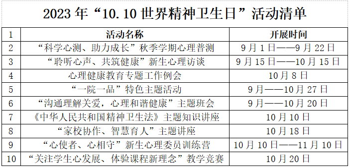 为深入宣传《中华人民共和国精神卫生法》、贯彻落实《全面加强和改进新时代学生心理健康工作专项行动计划(2023—2025年)》文件精神,深入推进我校心理健康教育工作育人实效,宣传、普及精神卫生防护知识,推动大学生增强心理健康意识、关注精神卫生需求,我校围绕2023年“10·10世界精神卫生日”,开展了主题为“沟通理解关爱,心理和谐健康”的系列宣传教育活动。