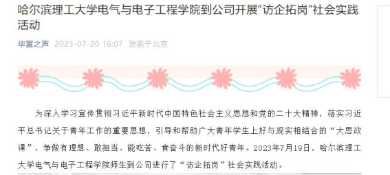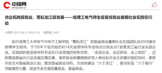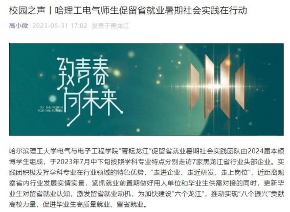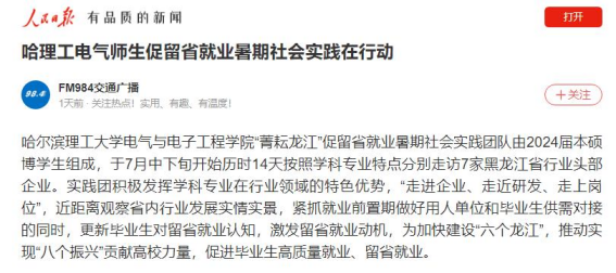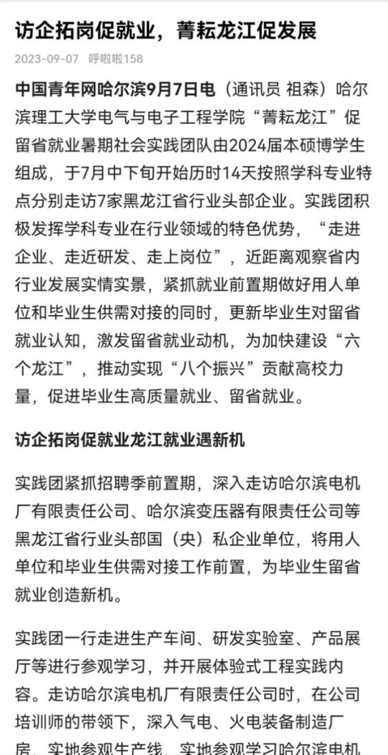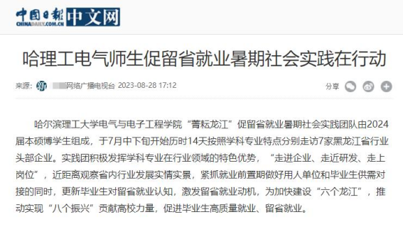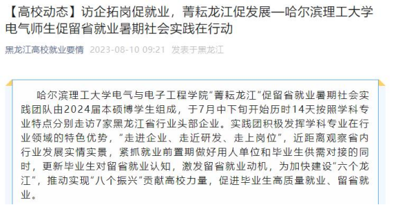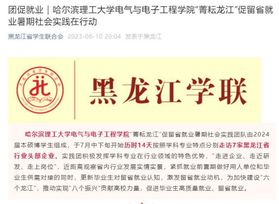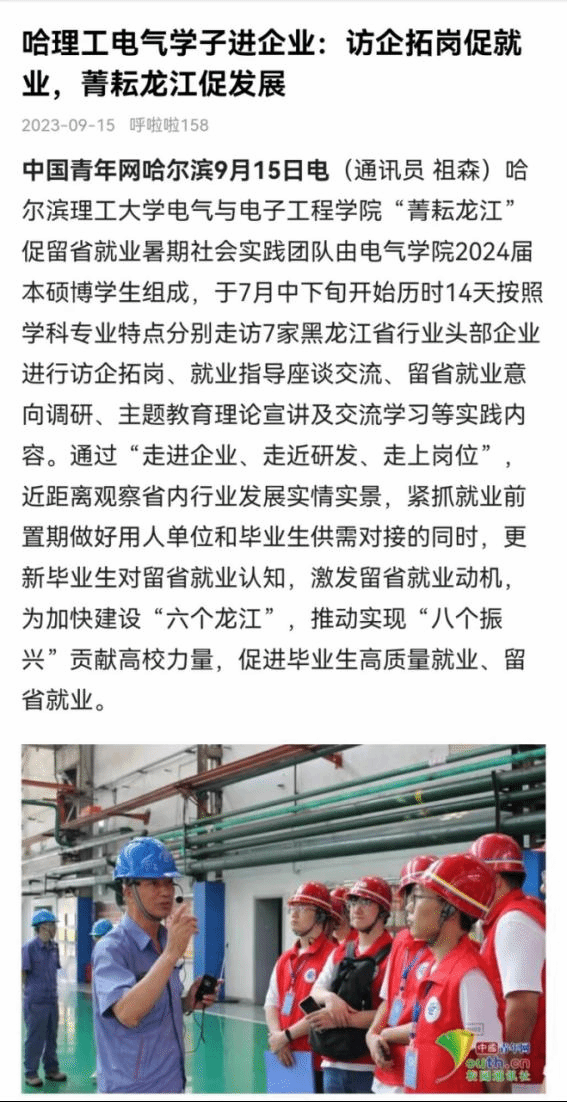 今年暑期,哈尔滨理工大学电气与电子工程学院“菁耘龙江”促留省就业暑期社会实践团队在东北振兴战略实施20周年之际,锚定振兴东北实践目标,嵌入战略支撑实践路径,强化科技创新推动产业创新实践情怀,激发留省就业实践信心,于7月中下旬开始历时14天按照学科专业特点分别走访7家黑龙江省行业头部企业进行访企拓岗、就业指导座谈交流、留省就业意向调研、主题教育理论宣讲及交流学习等实践内容。通过“走进企业、走近研发、走上岗位”,近距离观察省内行业发展实情实景,紧抓就业前置期做好用人单位和毕业生供需对接的同时,更新毕业生对留省就业认知,激发留省就业动机,为加快建设“六个龙江”,推动实现“八个振兴”贡献高校力量,促进毕业生高质量就业、留省就业。此次活动被人民日报、中国日报网、中国网、中青校园、中华网、极光新闻、网易新闻、黑龙江高校就业要情、黑龙江学联等25个媒体报道,共发表新闻宣传稿件达120余篇,总浏览量达10W+。