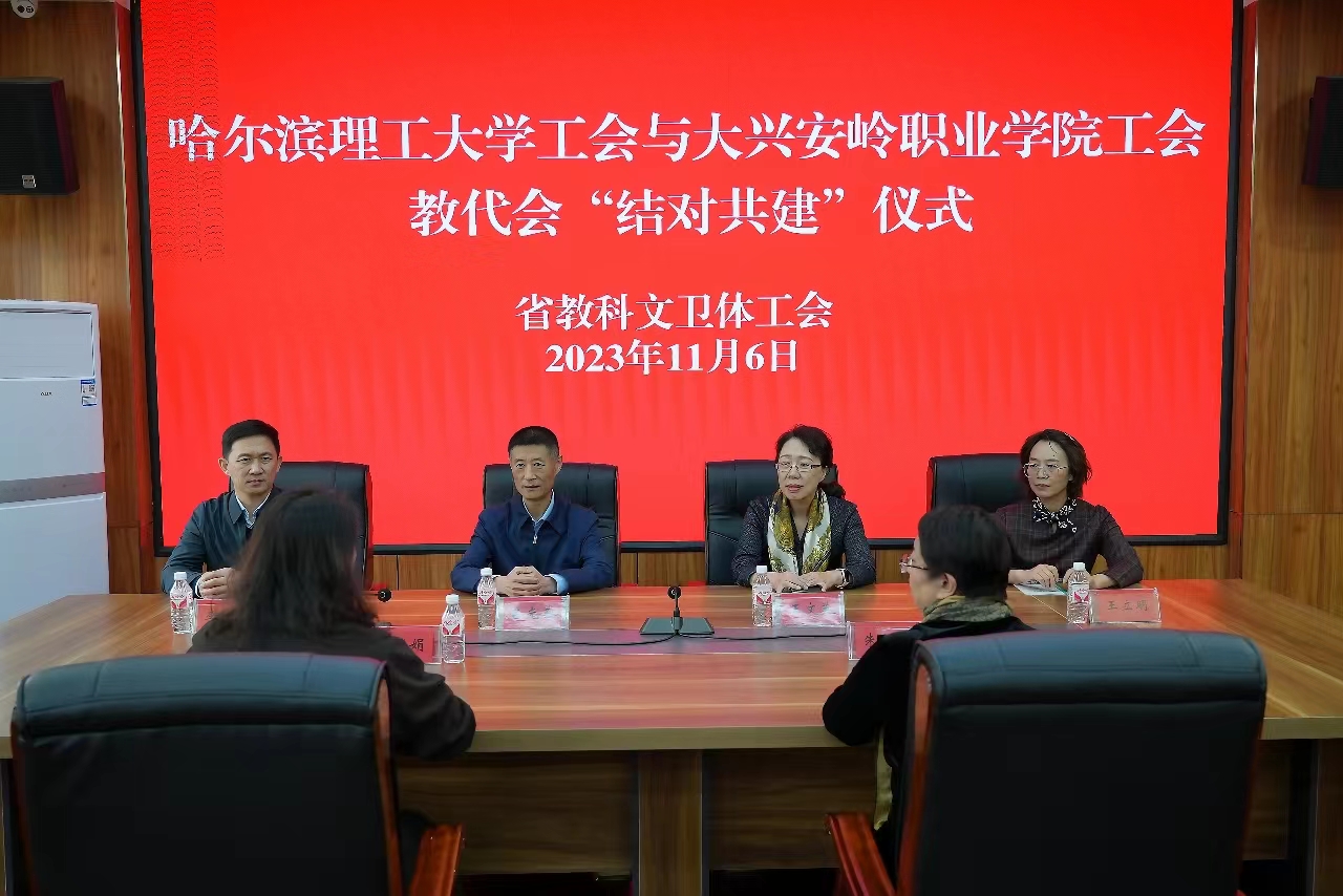 为贯彻落实中国工会十八大精神,深入推进高校教职工代表大会规范化建设,在省教科文卫体工会的倡导下,11月6日,我校工会与大兴安岭职业学院工会在省总工会第三办公区8楼会议室联合开展教代会“结对共建”活动。省总工会党组成员、省教科文卫体工会主席吕光英,省教科文卫体工会委员会副主席、一级调研员李永强参加共建仪式。