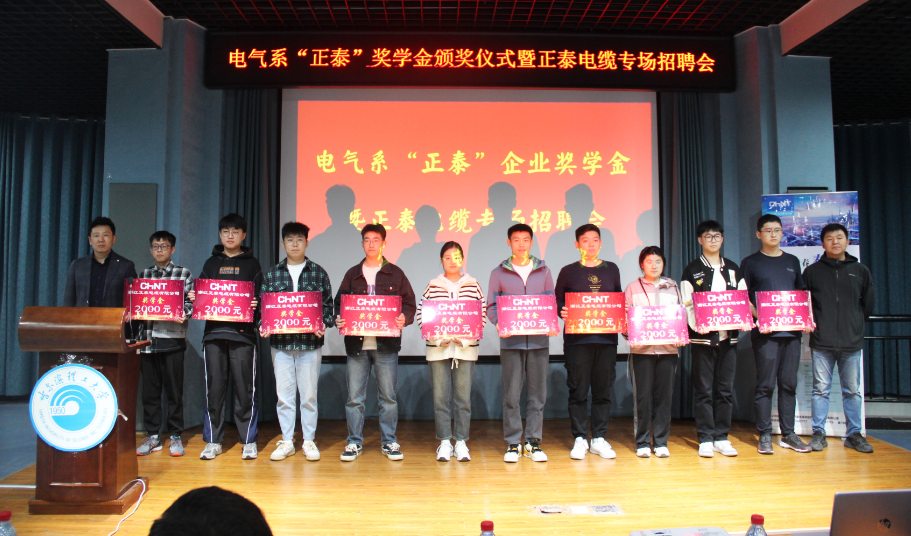 任新光副主任对正泰电缆设立奖学金表示感谢,希望今后继续强化校企合作,为学生更好的成长成才助力。龚广伟经理宣读了获奖同学的名单,何永吉副总工程师与赵运平副书记为获奖同学颁奖。