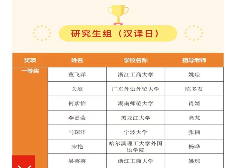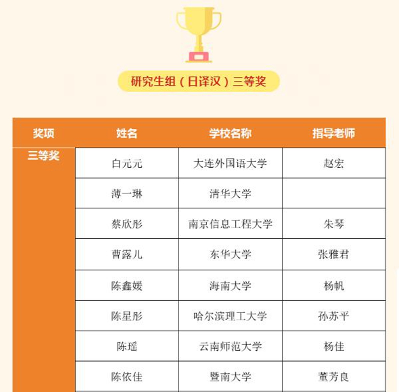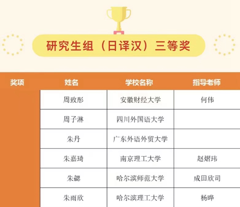 此外,23级日语笔译研究生刘昀策获得研究生组“汉译日”赛道三等奖、23级日语笔译研究生朱雨欣、22级日语语言文学研究生陈星彤获得研究生组“日译汉”赛道三等奖。