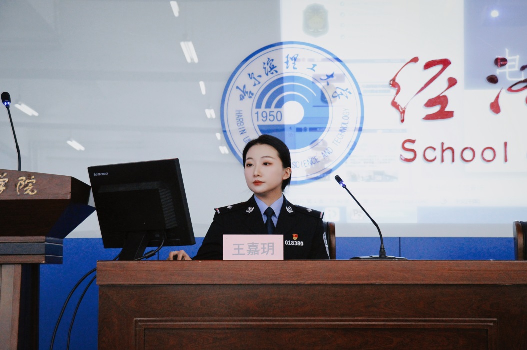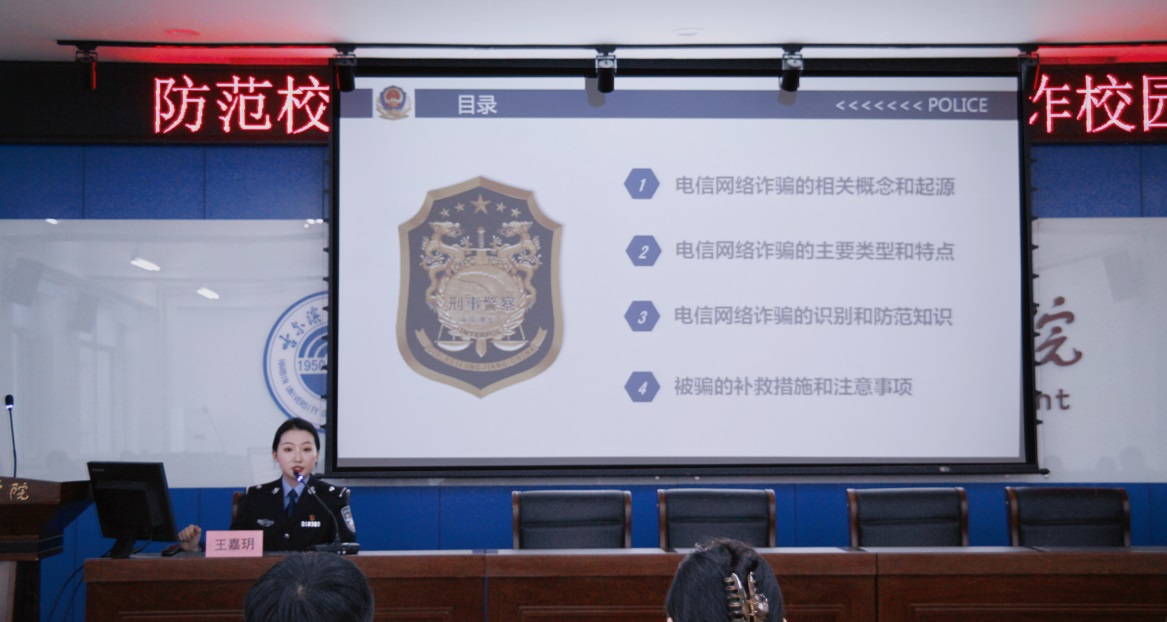 为切实增强经管学子识骗防骗意识、能力,有效减少、杜绝院内电诈案件发生,严防学生群体参与、帮助电信网络诈骗行为,经济与管理学院组织开展“防范校园电信诈骗,共建安全无诈校园”主题教育讲座活动。讲座邀请哈尔滨市公安局南岗分局新型犯罪侦查大队王嘉玥警官主讲。经济与管理学院党委书记周长群、党委副书记李国辉、学生会(研究生会)指导教师梁禹淇、就业专项工作教师徐大庆参加了讲座。学院团委、研究生会、学生会、青年志愿者协会、第二课堂、思想研究会等学生组织的骨干代表及学生、研究生班级代表到场学习。