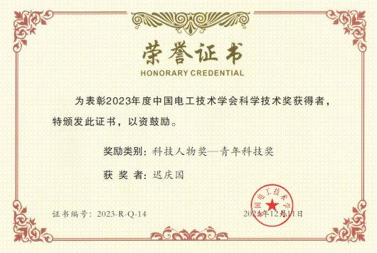 我校电气学院迟庆国教授喜获2023年度中国电工技术学会青年科技奖
