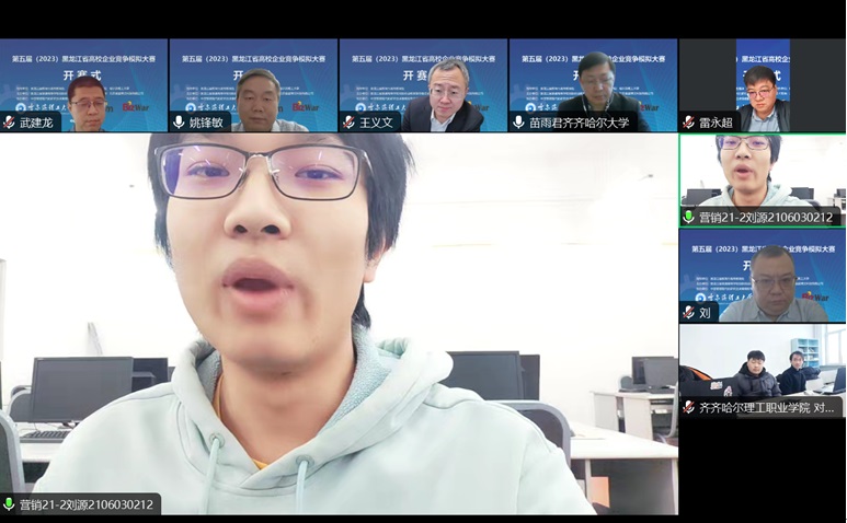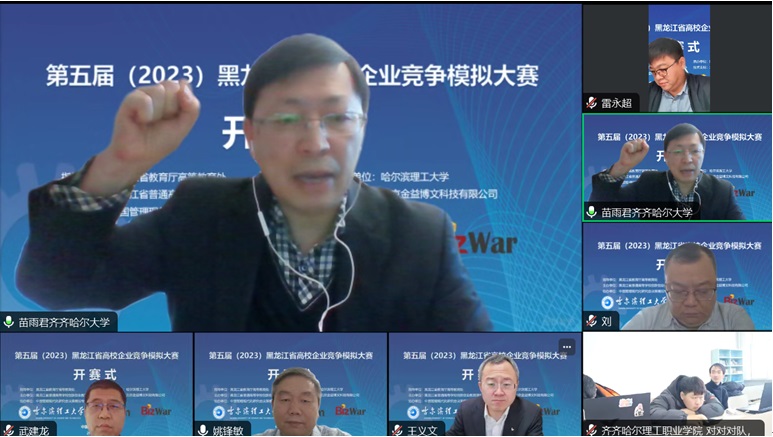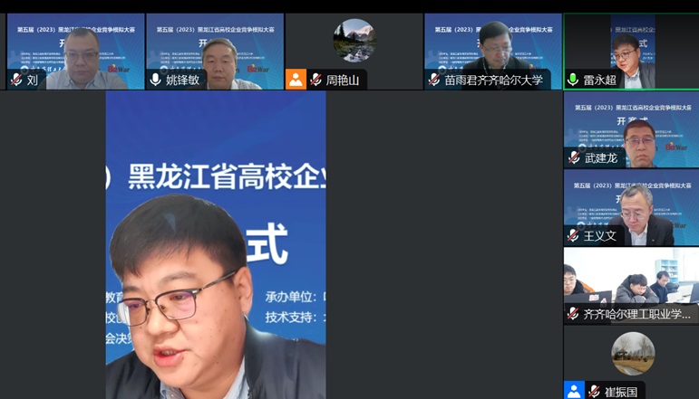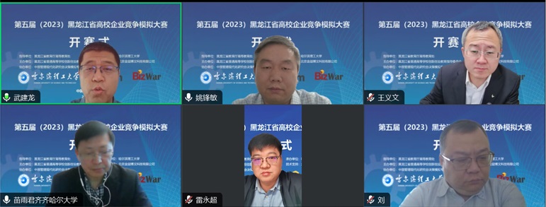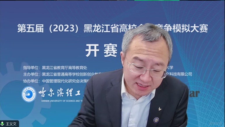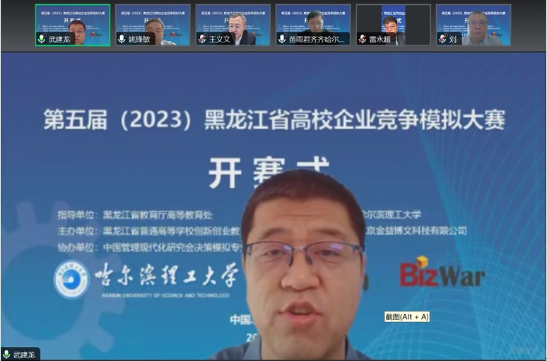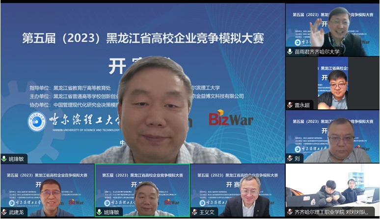 总决赛开幕式于12月10日上午9:00在线上开始,出席开幕式的领导与嘉宾有黑龙江省教育厅高等教育处副处长雷永超,哈尔滨理工大学教务处处长王义文教授,哈尔滨理工大学经济与管理学院院长武建龙教授,黑龙江大学创新创业学院副院长刘玉峰教授,齐齐哈尔大学经济管理学院副院长苗雨君教授,北京金益博文科技有限公司总经理/中国管理现代化研究会决策模拟专业委员会秘书长朱斌丹,开幕式由哈尔滨理工大学经济与管理学院副院长姚锋敏主持,各学校参赛队伍带队老师和全体参赛队员线上参会。