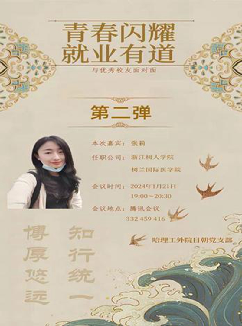 1月21日,党支部书记杨晔博士邀请了现就职于浙江树人学院树兰国际医学院的张莉作了题为“高校就职如何做好职业规划”的报告,拉开了系列活动的第二场。树兰国际医学院也是浙江大学的教学医院。张莉是我校2014级日语专业MTI笔译方向硕士毕业生,在学期间勤奋刻苦,成绩优异,能力突出。曾就职于哈尔滨工程大学水声工程学院、哈尔滨工业大学经济与管理学院。