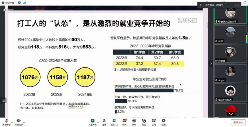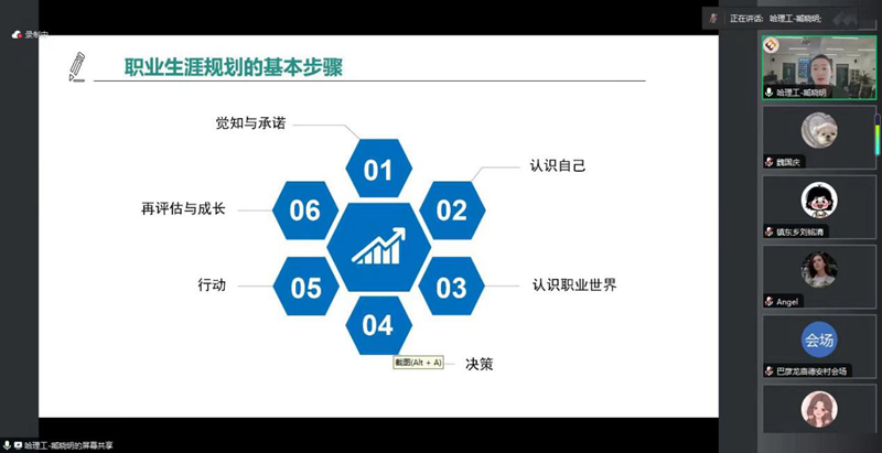 李贝老师以“物流行业发展趋势与职业机会”为题,通过德邦物流近年来发展情况解析未来就业求职的方向和机遇;魏国庆老师以“智联招聘数据下的大学生就业趋势”为题,结合智联招聘大数据分析当前以及未来几年的就业形势;臧晓明老师以“大学生职业生涯规划的意义与如何进行自我探索”为题,通过详实的案例跟同学们分享人生成长经历。三位老师的授课,主题聚焦、数据详实、案例实用,为同学们提供了全面系统的职业生涯规划与就业指导服务。驻村工作队聘请三位专家担任大学生的职业规划导师,建立“一生一策”帮扶档案,常态化开展精准指导和帮扶。驻村工作队员臧若家和芦忠魁分别从学业规划、心理健康教育和假期安全等方面与同学们进行了现场交流互动。