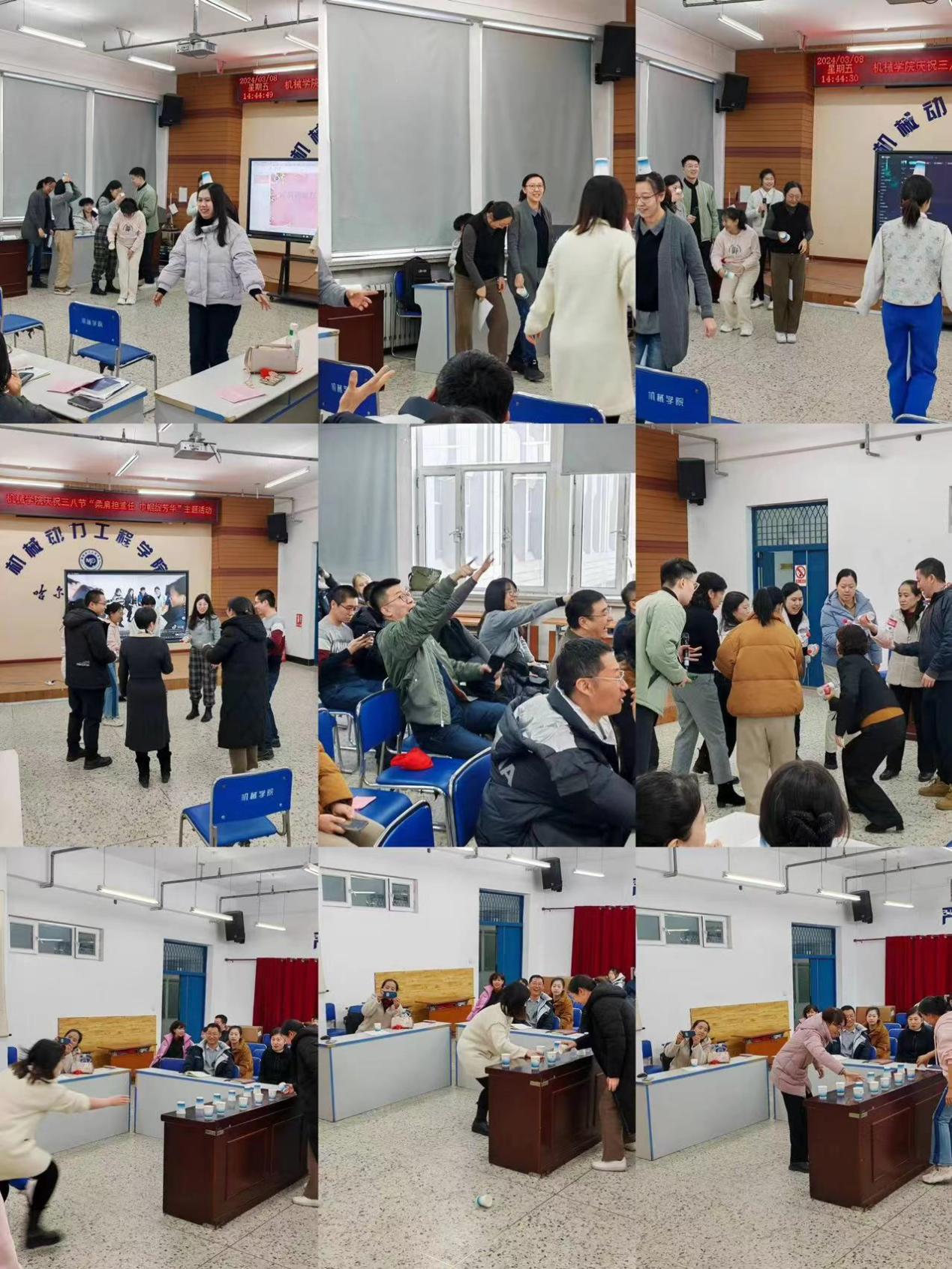 随着一段精彩的民族舞拉开序幕,由学生木扎帕尔和木艾塔尔热烈开场。宁秋丽老师带领12位女教师合唱了《你笑起来真好看》,展示了女性的坚韧、智慧和魅力。接着,鲍玉冬等5位老师表演了手势舞《爱》,为观众带来了一场视觉盛宴。最后,叶春丽等三位同学合唱了《枕着光的他》和工匠合唱团演唱的《哈理工之歌》作为结尾,开始了趣味游戏阶段,包括“移花接木”、“猜电影”、“夹纸传杯”、“翻杯子”四个环节,每一个游戏环节都充满欢声笑语,同时通过趣味游戏活动进一步增进了教师队伍的凝聚力和向心力。