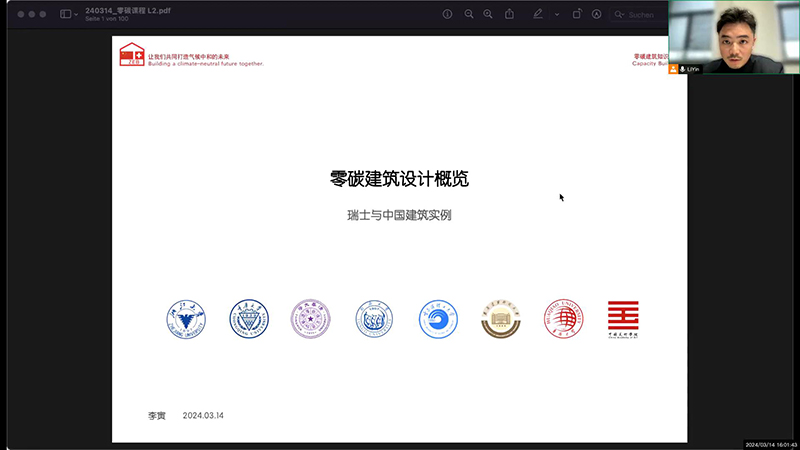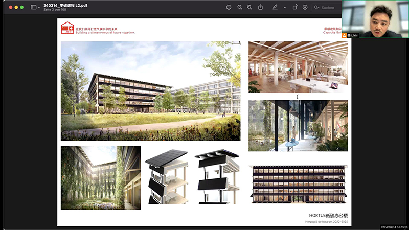 首场讲座于2024年3月6日北京时间下午16:30—18:00成功举办。中瑞零碳项目组总经理Wesley Wojtas先生,宣讲人Adrian Altenburger教授,以及多位中瑞零碳专家团成员作为参会嘉宾参与讲座,讲座由中瑞零碳建筑合作项目瑞方本地首席顾问、浙江大学建筑设计研究院有限公司主持建筑师、瑞士联邦建筑师与工程师协会注册建筑师李寅老师主持。