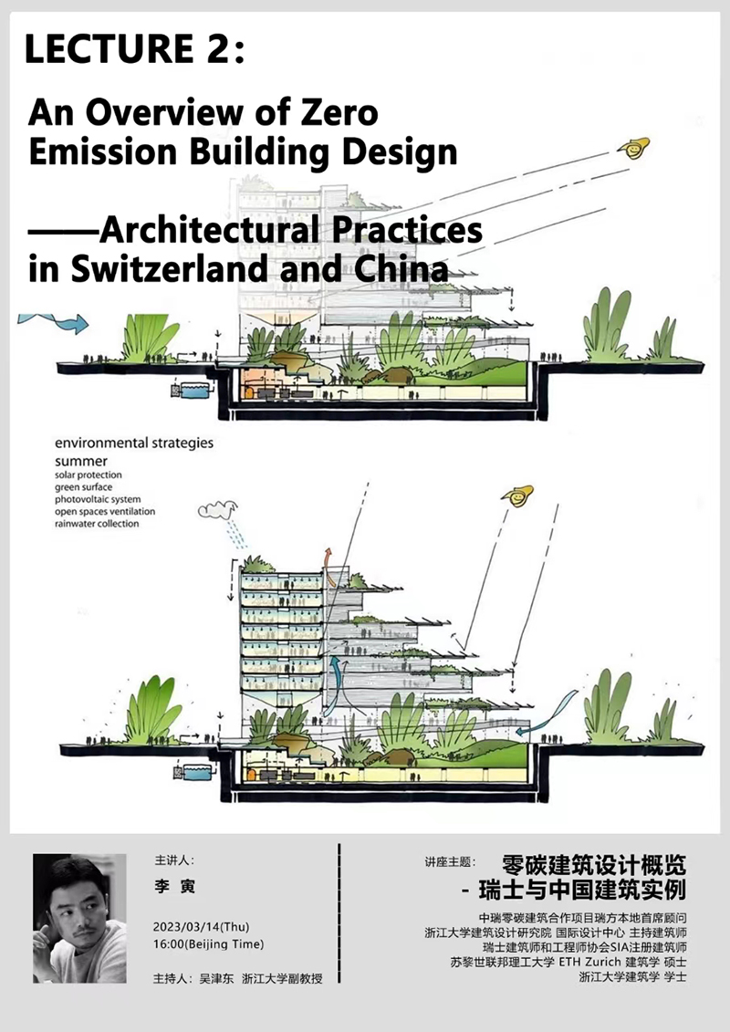 系列课程第二讲于3月14日下午16:00—17:30成功举办。浙江大学吴津东副教授主持了讲座,主讲人为李寅老师。李寅老师以“零碳建筑设计概览—瑞士与中国建筑实例”为主题,从零碳建筑基础知识、建筑隐含碳排放和材料选择以及典型零碳建筑案例等方面为学生做了精彩分享。