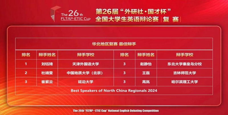 “外研社·国才杯”全国大学生英语辩论赛华北地区复赛于3月30日至31日于线上举行。我校外国语学院英语专业20-1高岚和23级英语研究生王安琪代表我校参加了此次大赛。比赛共有近90支来自北京、天津、河北和东三省的队伍参加。比赛采用英国议会制(BP)赛制,近200名辩手经过5轮的角逐,我校选手高岚同学最终以个人总积分前三名的成绩,获得最佳辩手荣誉称号,我校参赛队最终获得华北地区赛二等奖的优异成绩。此次比赛得到教务处及外国语学院领导的高度重视和大力支持。