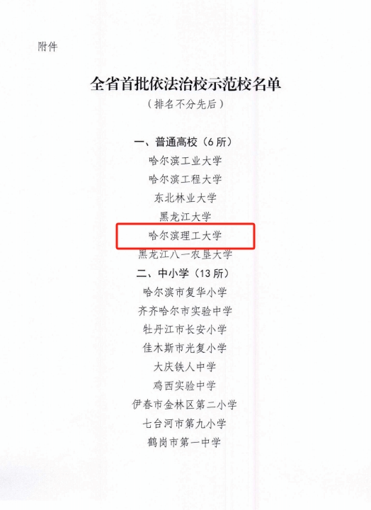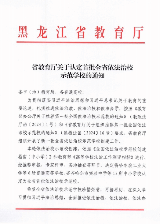 近日,省教育厅印发了《关于认定首批全省依法治校示范学校的通知》,我校获评黑龙江省首批依法治校示范校,全省共有6所高校入选。