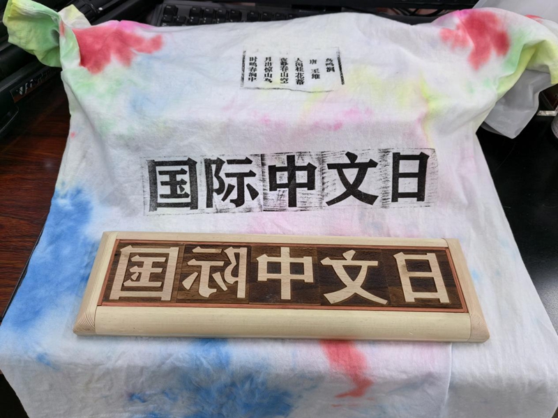 留学生们通过选字、精心排版、巧妙刷墨、细致拓印等一系列工序,深入体验了活字印刷这一古老技艺所散发出的独特魅力和深厚文化底蕴。他们不断尝试调整排版顺序,精细控制刷墨的浓度,以及恰到好处地掌握拓印的力度,将“国际中文日”的标识或古诗词巧妙地印在宣纸上,甚至创新地印在了色彩斑斓的扎染T恤上。每一件作品都是他们匠心独运的结晶,都承载了他们对中文文化的热爱和敬仰。