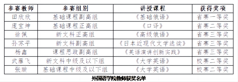 4月27日,由黑龙江省教育厅主办、哈尔滨工程大学承办的第四届黑龙江省高校教师教学创新大赛圆满落幕。历时四个月,经过三轮的激烈角逐,外国语学院俄语系田欣欣获省赛一等奖,英语系庞宝坤获省赛二等奖,俄语系徐佩、日语系孙苏平、英语系杨鑫获省赛三等奖。
