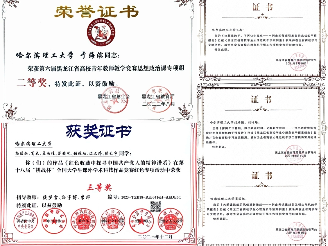 近年来,心理专兼职教师多次获得教育部、黑龙江省教育厅等组织的科研立项,出版专著多部,有数十篇论文发表于核心刊物;指导第十八届“挑战杯”全国大学生课外学术科技作品竞赛获全国三等奖;获黑龙江省第六届青年教师教学竞赛二等奖;3项心理危机干预案例入选省优秀案例选编并推广宣传。心理教研室主任吕彬江获全国大学生“心理健康教育工作先进个人”、全国大学生“心理健康教育二十年奉献奖”;4名兼职心理咨询师获评黑龙江省“最美高校辅导员”等荣誉称号。我校教师积极参加抗击新冠肺炎疫情心理服务,获教育部心理服务平台和黑龙江省教育厅、黑龙江省应用心理学学会的表彰,取得良好的社会反响。