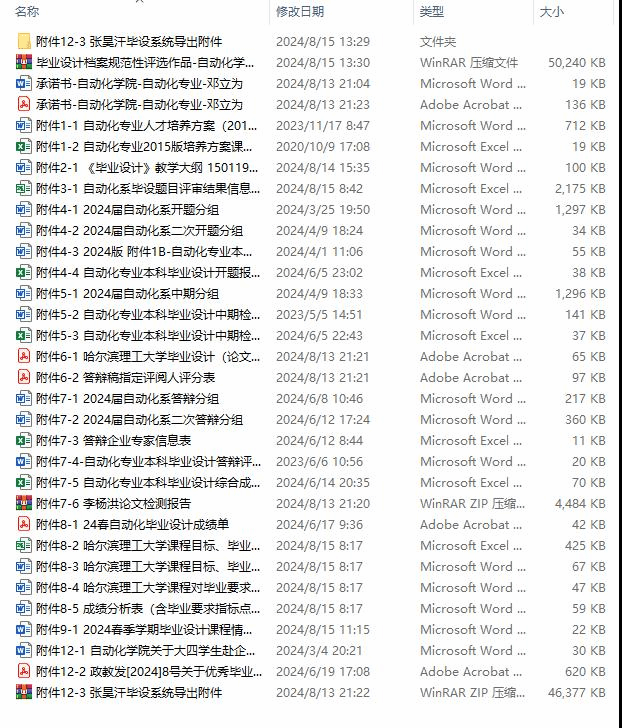 自7月13日至8月27日,自动化系的杨宁、张宇、史云玲、吴迪四位骨干教师积极参与到本科自动化专业专业课试卷与达成度材料的整理工作中。他们针对2021年秋季学期至2024年春季学期的本科期末试卷、成绩单、达成度等材料,按学期顺序严格分类、编码,确保材料科学、系统地归档。在归档过程中,他们不仅对试卷、达成度材料以及过程性考核材料进行分类,还为每个学期的材料生成目录表,以便后续查阅与评估认证的便利。这些工作反映了教师们的高度责任感与严谨态度,确保了每一份材料的准确性与完整性。同时,系内其他专业课教师也积极配合,并按时提交相关材料,为学院自评估工作开展做好准备。