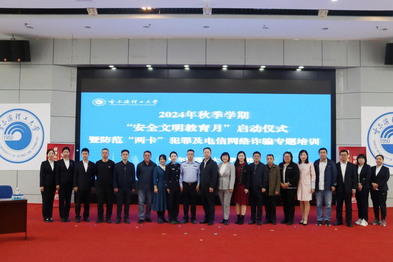 为深入贯彻落实省委、省政府和省教育厅关于《黑龙江省2024年安全工作有关要求》和《哈尔滨理工大学2024年学生安全教育工作要点》,进一步增强学生法制观念和金融安全意识,提高学生电信网络诈骗识骗防骗能力。9月29日上午,由党委学生工作部主办,“一站式”学生社区-党员e家育人工作室承办的2024年秋季学期“安全文明教育月”启动仪式暨防范“两卡”犯罪及电信网络诈骗专题培训在西区一号楼0220报告厅成功举办。龙江银行哈尔滨分行、哈尔滨市公安局南岗分局相关同志,党委学生工作部班子成员、各学院学生工作负责人及辅导员,各学院安全稳定信息员代表以及学生处工作人员参加本次培训。培训由党委学生工作部副部长田海燕主持。