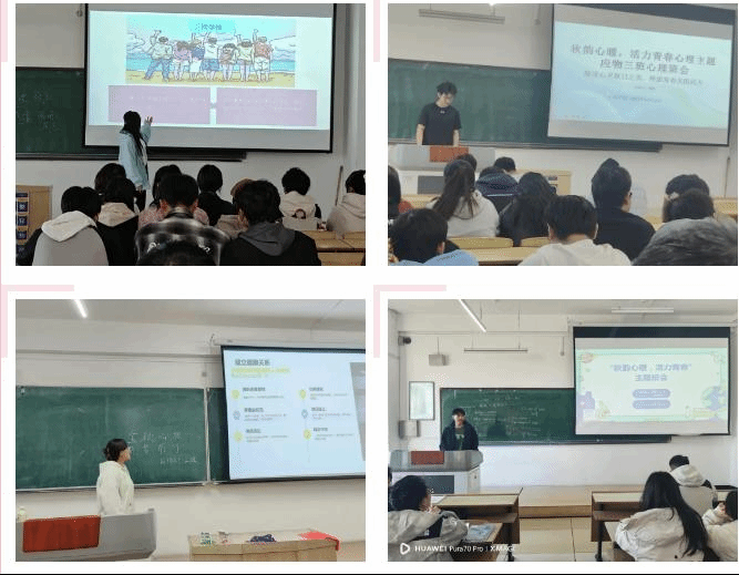 自动化学院积极开展“秋韵心暖,活力青春”心理健康教育主题班会活动,通过传播⼼理健康知识,提高学生的获得感、幸福感。同时增强大学生克服困难、经受考验、承受挫折的能力和团体意识。此次活动各班级积极宣传心理健康知识和拥有健康心理的意义,同时扩大心理咨询的影响,让同学们正视心理问题,注重心理健康。