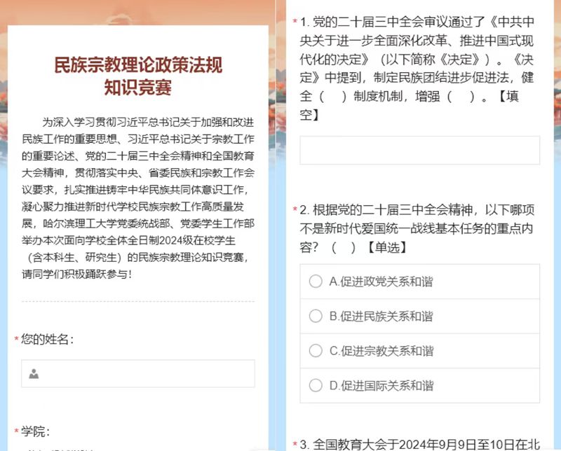 为深入学习贯彻习近平总书记关于加强和改进民族工作的重要思想、习近平总书记关于宗教工作的重要论述、党的二十届三中全会精神和全国教育大会精神,贯彻落实中央、省委民族和宗教工作会议要求,扎实推进铸牢中华民族共同体意识工作,凝心聚力推进新时代学校民族宗教工作高质量发展,哈尔滨理工大学党委统战部、党委学生工作部于10月22日至28日举办了面向学校全体全日制2024级在校学生(含本科生、研究生)的民族宗教理论知识竞赛,吸引了来自不同年级的8828名学生同场竞赛。