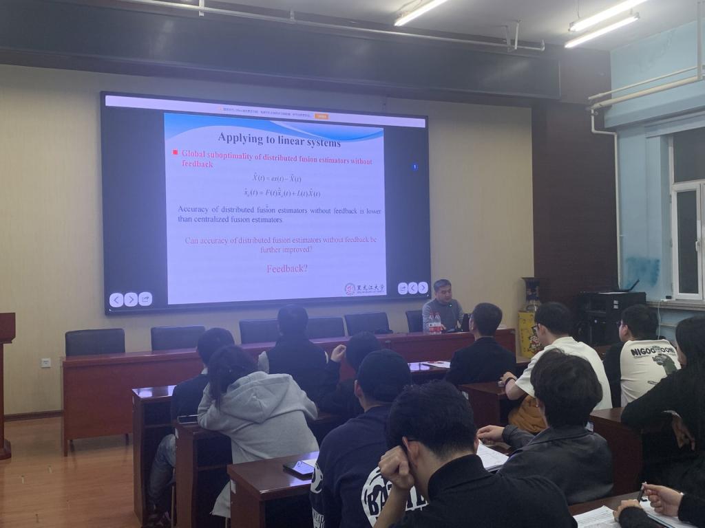 报告会上,孙书利教授主要介绍了多传感器系统分布式信息融合估计方法的一些最新研究成果。首先,介绍了不同融合机制的原理及优缺点;其次,在线性无偏最小方差准则下,结合先验融合估计,提出了一种通用的分布式递推线性融合估计算法;接着,将其应用于线性离散系统和随机参数化系统,分别提出了带反馈和不带反馈的分布式递推融合估计器,并给出算法稳定性及稳态特性的分析。最后,针对带反馈的分布式递推融合估计给出全局最优性分析。