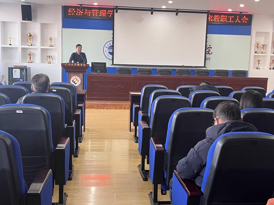 1月2日,经济与管理学院在学术报告厅召开全院教师大会,传达学校干部及骨干教师大会精神,部署本年度学院各项重点工作,引导全院教师统一思想,真抓实干,以优异业绩努力完成学院“十四五”发展规划确定的各项任务,合力绘制学院发展的崭新蓝图。大会由学院党委书记周长群主持。
