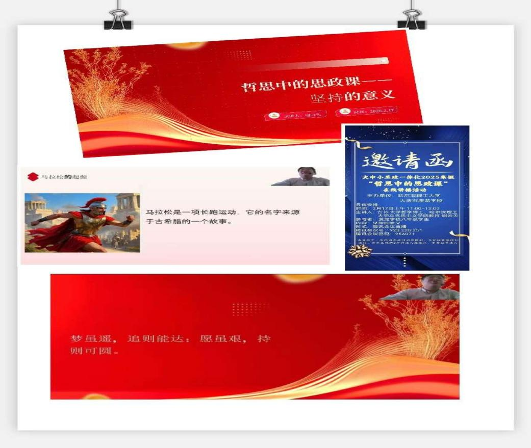 为深入贯彻党的二十届三中全会精神,进一步提升大中小学思政课一体化的共建质量与效果,校大中小学思政课一体化研究中心与大庆市澳龙学校于2025年2月17日成功举办了大中小学思政课一体化建设:2025寒假系列特别活动——“哲思中的思政课”。本次活动由马克思主义学院、校大中小学思政课一体化研究中心(以下简称研究中心)与大庆市澳龙学校共同策划,特邀马克思主义学院谢云天老师担任主讲,以“认识你自己”与“坚持的意义”为题,通过云端平台分别为大庆市澳龙学校七、八年级学生开启了一场关于自我认知与生命成长的哲学思辨之旅。活动以生动寓言叩击心灵,在思想碰撞中引领学生探寻思政教育的深层意蕴。