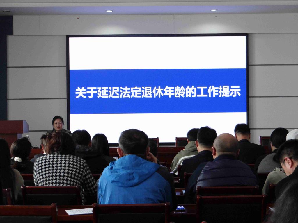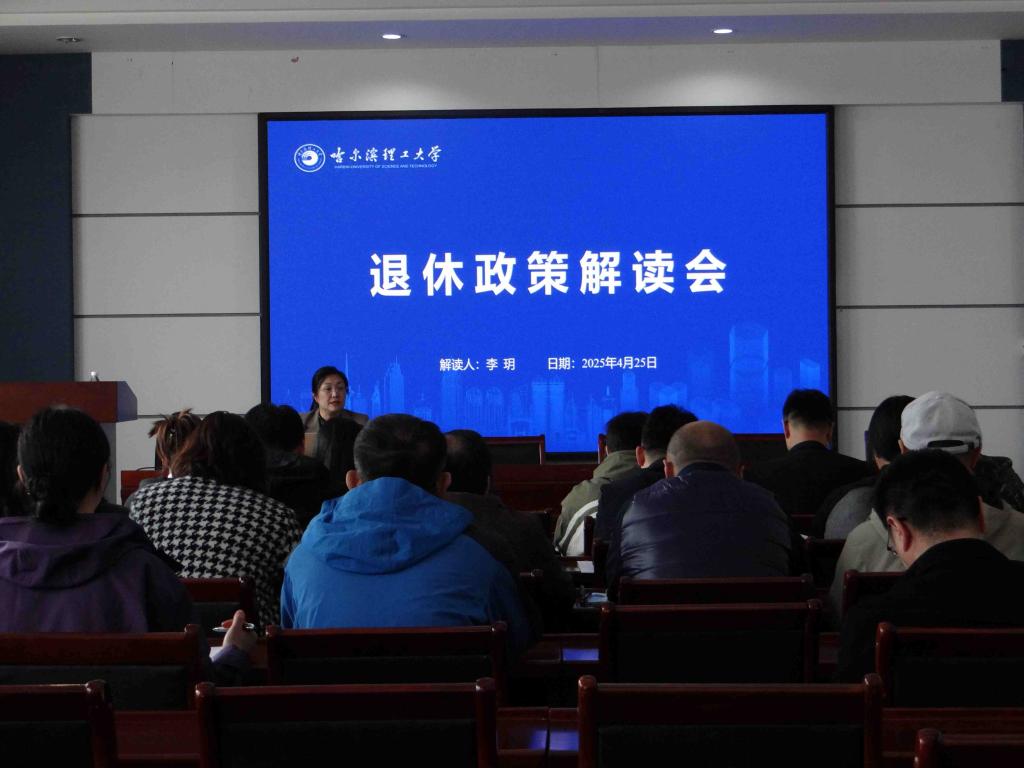 为深入贯彻落实国家关于渐进式延迟法定退休年龄及弹性退休制度决策部署,我校于2025年4月25日下午在教学主楼G1012会议室组织召开退休政策专题解读会。人事处处长李玥作专题政策解读,各二级单位人事工作负责人共计50余人参会。
