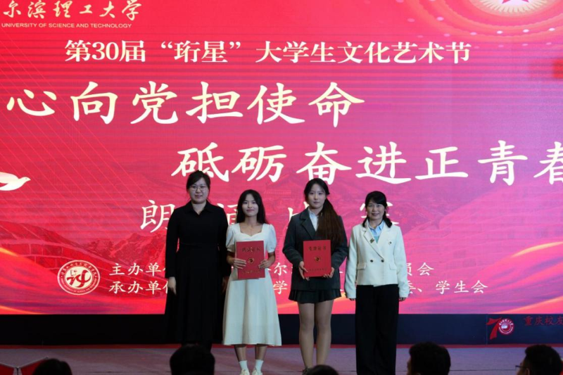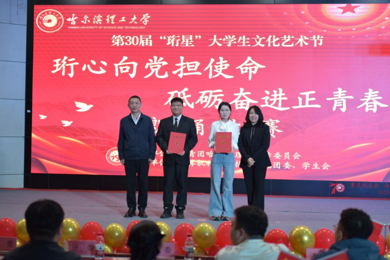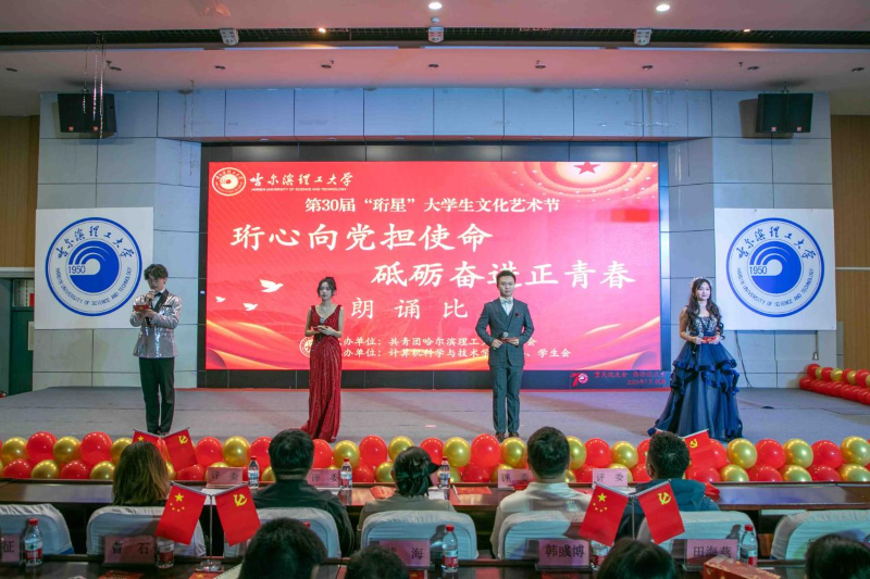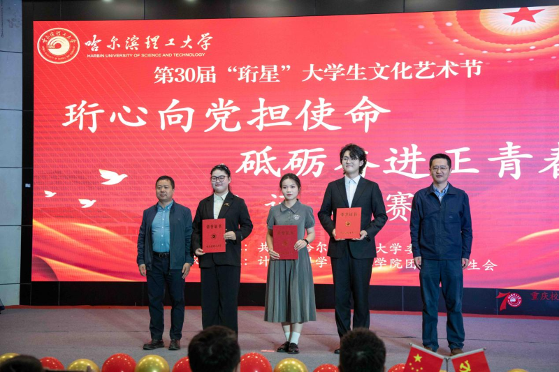 为贯彻落实习近平总书记关于青年工作的重要指示精神,弘扬爱国主义精神,以文化人,以文育人,用声音传递情感,用语言表达爱国情怀,感受中国红色文化的魅力,让学生在运用朗诵的艺术表现形式中感受红色精神的内涵和意义。6月10日18时,哈尔滨理工大学第三十届大学生文化艺术节暨“珩心向党担使命,砥砺奋进正青春”第三届朗诵比赛决赛在西区1号楼0220报告厅成功举办。校团委书记韩彧博、校党委学生工作部副部长田海燕、副部长曹石、副部长兼大学生就业指导中心副主任崔征、校团委副书记段云菲及计算机科学与技术学院领导班子、兄弟学院党委副书记、团委书记、学生会指导老师、全体辅导员出席本次活动,与现场500余名学生共同观演。